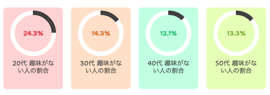 30代では趣味があると回答した人が多く、もし今あなたに趣味がなくても何かにチャレンジしたら見つかる可能性は高いことが以下の図でわかります。また、同じ趣味の人同士での交流等を通じ、これまで会社だけだったコミュニティが広がり、多くのメリットがあると考えられます。