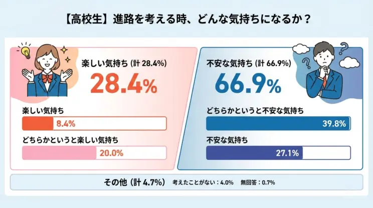 2023年に全国高等学校PTA連合会とリクルートによって過去に行われた調査によると、高校生の半数以上が「自分の進路に不安を抱えている」と回答しています。