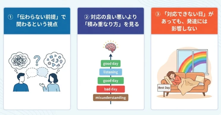 一場面ごとの出来、不出来よりも、長い目で見た関わりの流れとして捉えることが、気持ちを楽にする助けになります。