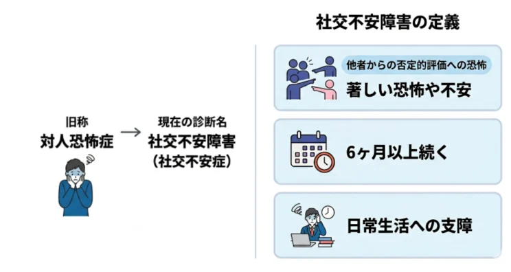 社交不安障害は、他者から否定的に評価されることへの著しい恐怖や不安が6ヶ月以上続き、日常生活に支障をきたしている状態として定義されています。